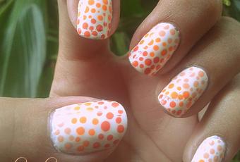Me gusta mucho este reto porque eso de hacer puntos es muy fácil ademas de que quedan muy lindos. Esta vez he optado por hacer el degradado de color en tonos naranjas, los puntos los he hecho de tamaños diferentes y por esta vez no he seguido una secuencia; los hice regados pero eso si siguiendo el orden del degradado. Utilice tres tonos diferentes de naranja y para resaltar el color puse de base un tono blanco.