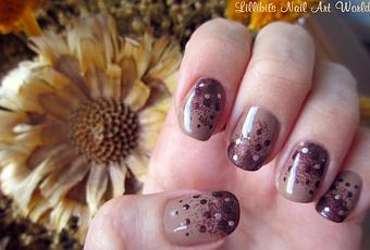 Apliqué una base nude y sobre ella, con una esponjita, hice un degradado sencillo en un tono marrón. En las uñas del pulgar, corazón y meñique el degradado comienza en la zona del borde libre, y en las uñas del índice y anular comienza en la zona de la cutícula. A continuación, con el dotting tool hice puntos con el mismo esmalte marrón de distinto tamaño: más grandes en la zona marrón y más pequeños hacia la zona nude. Mi intención era que los puntos también tuvieran un "degradado" en cuanto a su tamaño.