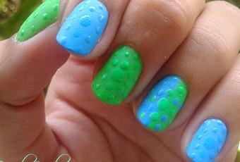 Esta vez he optado por dos tonos que me encantan como lucen juntos, y de hecho me encantaron más al hacerlos mate. Los puse en dos dedos cada uno y en el dedo anular puse mitad y mitad de color. Les aplique el esmalte mate y con el puntero y con los mismos esmaltes realice los puntos de manera que formaran círculos, el punto del centro lo hice un poco más grande.