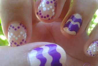 En las demás uñas realicé el zig zag con puntos, ya que claro esta estos tienen que ser los protagonistas. Con un punzón delgado realice tres hileras en cada uña siendo la hilera del centro blanca y las demás moradas.