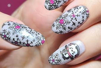La estampación la hice con un esmalte holográfico, así que otro motivo más para que haya brilli en la manicura 😉. Los copos de nieve son de estampación directa y el pingüino es una reverse. En el centro de los copos puse un puntito rosa fucsia, el mismo color de la bufanda y orejeras del simpático pingüino.