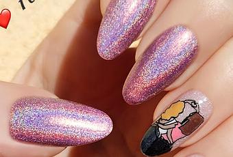 Me apeteció acentuar estas dos uñas 😂. En la del anular tenemos a dos amigas abrazadas y haciendo un corazón con sus manos. ¿Puede ser más bonita esta imagen? Y en el meñique tenemos las palabras "Best friends" y una sticker de un corazón. Aquí tenemos de cerca la uña de anular: