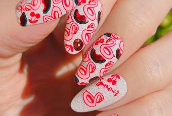 La estampación la hice en rojo (reverses), de una imagen de uña completa, con flotadores en forma de flamenco, sandías, cerezas y donuts (que realmente no sé qué pintan en el diseño 😅, y coloreé unos de marrón oscuro (chocolate) y otros claritos (chocolate blanco)). Hubo un problema con las sandías: quise colorear las pepitas de marrón pero el esmalte usado para colorearlas resulta que se ve mucho. Por eso las sandías se ven tan marrones 😒.