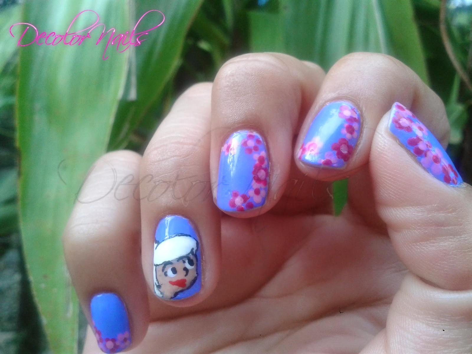 Decidí hacer a la hija de los supersonicos, Lucero (Judy) quise hacer a este personaje porque me encanta su cabello blanco. Las demás uñas las trabaje con flores en dos tonos diferentes de rosas sobre un fondo lila.