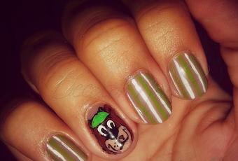 A falta de tiempo, me he hecho una manicura sencilla pero no dejando de lado al personaje, me lo he dibujado, lo realice con pinturas acrílicas y las demás uñas las hice a rayas con combinación a los colores que lleva el osito.