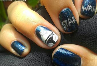 Todas las uñas las esmalte con un tono azul oscuro y sobre ese aplique un esmalte de glitter azul. con un esmalte de pincel delgado escribí la palabra "star wars" y al clon lo hice con pintura acrílica, solo dibuje la mitad de su rostro.