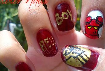 Con pintura acrílica dibuje en el dedo medio a Hellboy, me ha salido un poco raro pues un cuerno me ha quedado algo grande. En el dedo pulgar dibuje su logo y en las uñas de los dedos anular y medio escribí con pintura dorada su nombre.