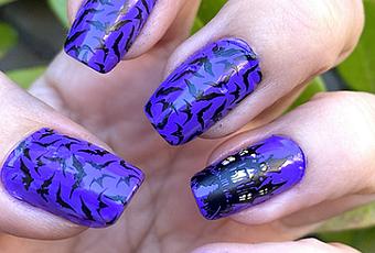 Para la manicura he aplicado la base antiescamación de Masglo, sobre ella aplique el Morado de Masglo, es un tono morado precioso e ideal como fondo para una casa encantada y bandadas de murciélagos que ha sido mi propuesta en esta ocasión. Aplicadas dos capas del esmalte morado estampé en la uña anular una casa encantada con sus ventanas iluminadas y en el resto de las uñas estampé murciélagos todo de la placa What'sUp B023 con el esmalte negro para estampar de Konad y para proteger toda la manicura usé el esmalte brillo de secado rápido de Masglo.