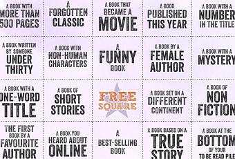 (De izquierda a derecha y de arriba a abajo) Un libro con más de 500 páginas • Un clásico olvidado • Un libro que se haya convertido en película • Un libro publicado este año • Un libro con un número en el título • Un libro escrito por alguien menor de 30 años • Un libro con personajes no humanos • Un libro divertido • Un libro escrito una autora • Un libro con un misterio • Un libro con un título de una sola palabra • Un libro de relatos cortos • Un libro ambientado en un continente diferente • Un libro de no ficción • El primer libro de tu autor favorito • Un libro que hayas descubierto online • Un best-seller • Un libro basado en una historia real • Un libro al final de tu lista de pendientes • Un libro que le encante a un amigo • Un libro que te de miedo • Un libro que tenga más de 10 años • El segundo libro de una serie • Un libro por portada azul. Bingo literatura juvenil