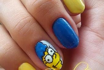He realizado a Marge en el dedo anular con pinturas acrílicas y con ayuda de un pincel delgado. Las demás uñas solamente las esmalte, dos de amarillo y dos de azul. Al dedo medio le dibuje el collar de Marge.