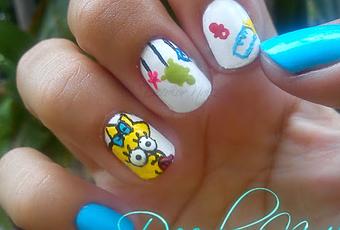 Como ven me he inspirado en los juguetes de bebe, dibuje a Maggie con ayuda de pinturas acrílicas, en el dedo medio dibuje un móvil y en el dedo indice dibuje un biberón y un chupón. Los demás dedos solo los esmalte de azul como el mameluco de Maggie.