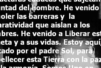 Y a esos manipuladores de la información y de los avances tecnológicos, le digo también, que se acabo su historia. No hay represarías, sino perdón. Y todos avanzamos así, en gloriosa libertad y respeto. Nada nuevo que decir, cada cultura sabe la esencia y todos la pronunciáis a diario, la humanidad que aún puede vivir con un mínimo de independencia, debe ayudar al resto que no puede. Pero es necesario que aquellos opresores liberen y aporte su conocimiento a la redención de forma tal, que transmuten sus cualidades ayudando a la humanidad una. De esta forma, en paz y serenidad, en equilibrio y trabajando por un mundo bello y acorde a la verdad. Podemos empezar a sacar aquello que no ha sido revelado aún y aquello que ha sido ocultado desde los más íntimo cotidiano a la gran verdad planetaria. A nuestro origen, a nuestro destino, a lo que somos y a la ausencia de muerte en la naturaleza. Se acabó la escuela de sufrimiento. Entra la resurrección un nuevo reino mas allá de todo grupo, escuela, pensamiento, ideología o lo que fuere… hablo de aquella chispa divina, de la manifestación transcendental que nos hizo humanos, el alma humana.