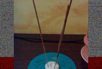 Limpiad con mucho cuidado las zonas ralladas para que vuelvan a brillar. A continuación coged una bola de masilla blanca de modelar o arcilla y, dándole forma de circulo, rellenar el circulo central del cd., dejando una capa de medio dedo de grosor, y usando el mismo palillo, haced agujeros para las varillas de incienso y en el centro un hueco más amplio para poder poner conos de incienso.