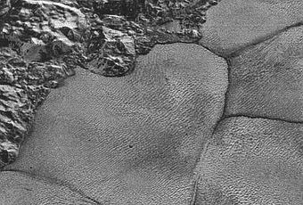 Superficie en Sputnik Planitia con patrones de polígonos. Imagen captada por New Horizons a unos 17.000 km de Plutón. Crédito: NASA/JHUAPL/SwRI.
