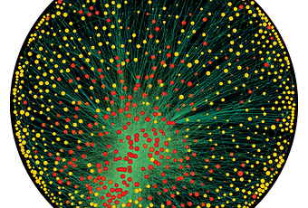 Las 1318 empresas transnacionales que forman el núcleo de la economía mundial.Las empresas superconectadas son de color rojo, las companias muy conectadas son de color amarillo. El tamaño del punto representa los ingresos. Tres científicos del Instituto Federal Suizo de Tecnología de Zurich estudiaron una base de datos de 37 millones de empresas de todo el mundo y buscaron las interconexiones entre ellas obteniendo las 43.000 multinacionales que las unían. Luego desarrollaron un modelo para estudiar la participación de las redes de accionistas que unían a estas multinacionales y llegaron a determinar un núcleo con 1.318 empresas (ver imagen), que representan el 60% de los ingresos mundiales.