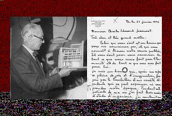 Le Corbusier en su estudio de la Rue de Sevres, en París, con la maqueta de la Casa Curutchet en abril de 1949. A la derecha, facsímil de la carta de presentación enviada por Amancio Willliams al arquitecto suizo-francés
