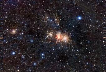 Una activa maternidad estelar se encuentra escondida dentro de una masiva nube oscura, rica en moléculas y polvo, en la constelación de Monoceros (el unicornio). Si bien en el cielo parece cercana a la conocida Nebulosa de Orión, realmente está a más del doble de distancia de la Tierra, a unos 2.700 años-luz. Un grupo de estrellas masivas y calientes crea una bella colección de nebulosas de reflexión donde la luz azulada de las estrellas se dispersa en algunas partes de la oscura y neblinosa superficie de la nube molecular. Sin embargo, la mayoría de las estrellas masivas recién nacidas se mantienen ocultas pues el grueso polvo interestelar absorbe fuertemente su luz ultravioleta y visible.En esta magnífica imagen infrarroja captada desde el Observatorio Paranal de ESO en el norte de Chile, el telescopio de rastreo VISTA (Visible and Infrared Survey Telescope for Astronomy) penetra la oscura cortina de polvo cósmico y revela con gran detalle los pliegues, curvas y filamentos esculpidos en la materia de polvo interestelar por los intensos vientos de partículas y la radiación emitida por estrellas jóvenes y calientes.