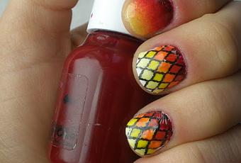 Se trata de un degradado de negro, rojo, naranja y amarillo. Y dos uñas decoradas por la técnica Reverse stamping en degradado también.