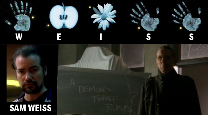 Algo que llevaba un tiempo esperando se ha cumplido en este episodio: La aparición de Sam Weiss. Para refrescaros la memoria, cuando Bishop y Bell visitan el Harvard del otro lado, podemos ver tras William una pizarra con el anagrama “A demon’s twist rusts” que aparentemente nos advertía que no confiáramos en Sam Weiss (Don’t trust Sam Weiss); y también era su apellido “Weiss” la palabra formada por los glyphs que van apareciendo en cada capítulo.