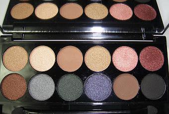 En la paleta vienen 12 sombras, y van desde el tono champán, dorados, rosita, un tono burdeos metalizado que me chifla (el situado más a la derecha de la primera fila), para pasar luego a marrones, algún azul y verde llamativo e incluso un negro mate polivalente.
