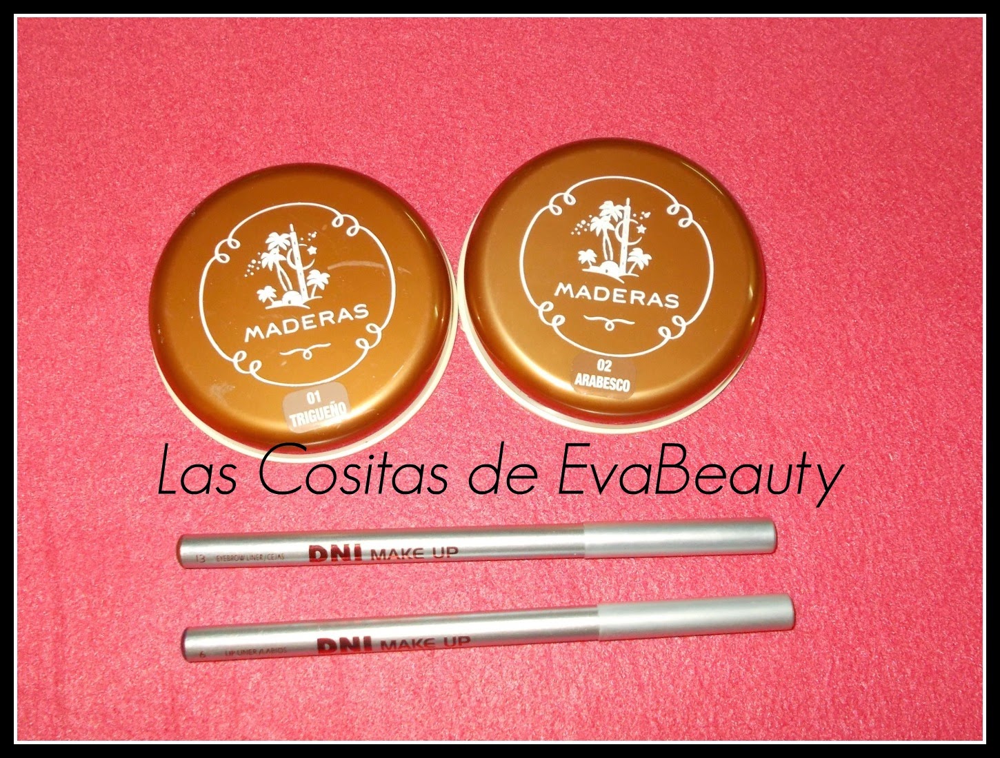 - Los polvos de sol trigueño y arabesco, con un lápiz para cejas en una revista, y en la otra un perfilador de labios.