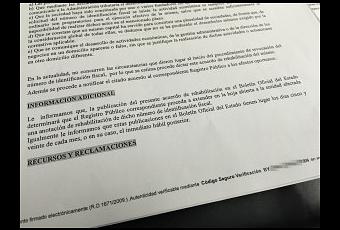 «Le informamos que, la publicación del presente acuerdo de rehabilitación en el Boletín Oficial del Estado determinará que el Registro Público correspondiente proceda a extender en la hoja abierta a la entidad afectada una anotación de rehabilitación de dicho número de identificación fiscal. Igualmente le informamos que estas publicaciones en el Boletín Oficial del Estado tienen lugar los días cinco y veinte de cada mes, o en su caso, el inmediato hábil posterior».