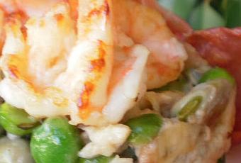 Revuelto "baboo" de chicharos y habitas babies con jamón y langostinos a la plancha