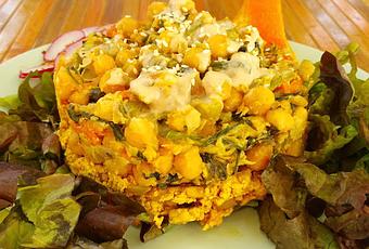 - Calentamos un poco de aceite de coco en una sartén. Sofreímos la cebolla y los ajos hasta que empiecen a dorarse. Agregamos las demás verduras y las salteamos hasta que empiecen a ablandarse. Añadimos los garbanzos y el tahini, salpimentamos, removemos y cocinamos otros 5 minutos removiendo de vez en cuando.