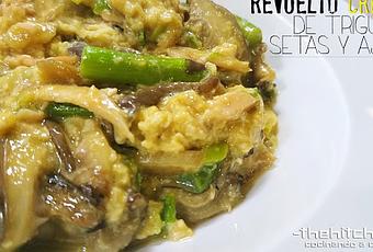 Este revuelto cremoso-cremoso viene acompañado de setas, espárragos y ajetes. Es casi como una receta de aprovechamiento, ya que los huevos nos ayudan a darle salida a infinidad de productos aislados en la nevera. Estos son mis "ingredientes perdidos" pero podéis tirar de gambas, champiñones, chalotas, puerros... Vuestra imaginación es la que domina la cocina. Escuchadla.