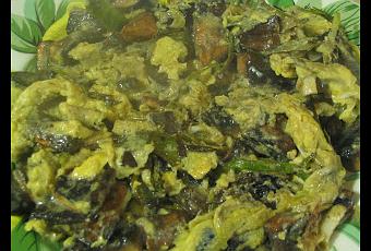 Y ya casi lo tenemos en su punto. Sólo nos falta añadir los 3 huevos bien batidos con su pizca de sal para obtener un jugosito revuelto de ajetes y setas. En casa nos gusta sin cuajar del todo. Ya se sabe que eso depende de cada persona. Nosotros también le incorporamos un poco de hierbas (muy poco, provenzales) y otro puntito de ajo en polvo.