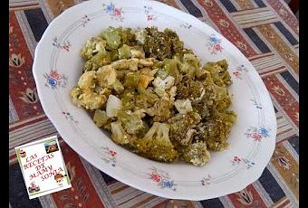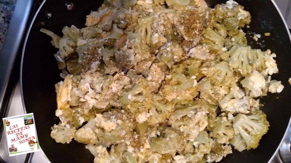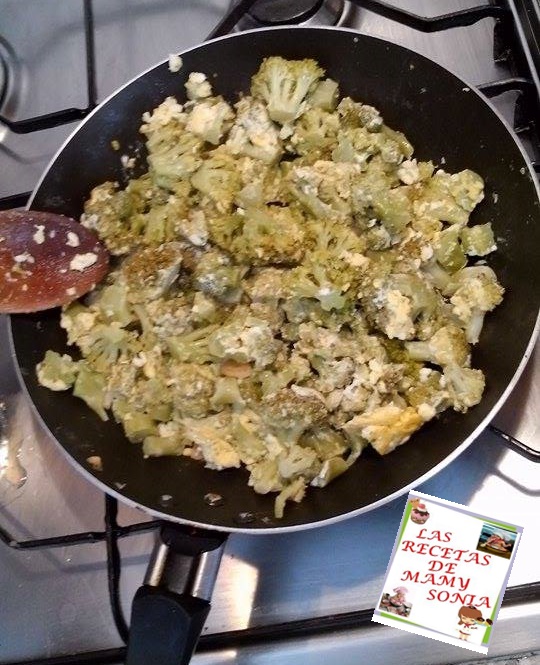 Picamos los dientes de ajo y los refreímos en una sarten con aceite cuando estén doraditos agregamos el brócoli mezclamos bien con los ajitos, le incorporamos los dos huevos, la sal y mezclamos bien hasta que se cuajen bien los huevos.