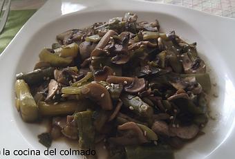 Unos espárragos verdes10-12 judías verdes1/2 cebollaUn trozo de alga kombuAceite de oliva virgen extraSal marina atlánticaUn chorrito de tamariSemillas de sésamoPREPARACIÓNPonemos en remojo el alga en un cuenco.Quitamos las hebras de las judías verdes, las lavamos y las partimos en trozos. Cortamos el final de los espárragos (la punta no, la parte más gorda) y, con un pelador, los pelamos más o menos de la mitad hacia abajo, para quitar las hebras más gruesas. Los lavamos y los partimos en trozos.En una cazuela, ponemos 2-3 dedos de agua, echamos las judías verdes y los espárragos, tapamos y dejamos que cueza a fuego medio-flojo unos 20-25 minutos. Al estar tapado, no necesitamos poner el fuego muy fuerte. En nuestra vitro (1-9) lo hemos puesto en el 5.Limpiamos los champiñones y los partimos en láminas. Picamos la cebolla. En una sartén, pochamos la cebolla con un chorrito de aceite, añadimos los champis y dejamos que se cocinen.Cuando los espárragos y las judías verdes estén tiernos, los escurrimos e incorporamos a la sartén con los champis. Añadimos una pizca de sal, un chorrito de tamari y rehogamos un par de minutos. Apagamos el fuego y añadimos el alga escurrida y picada.Servimos y espolvoreamos con unas semillas de sésamo.