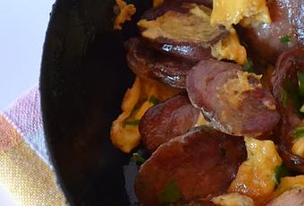 Batir los huevos de forma de romper el ligue.Llevar los chorizos nuevamente al fuego y agregar los huevos batidos. Cocinar removiendo suavemente, para evitar que se pegue la mezcla, hasta que comience a ver como se ve el fondo del sartén.Sacar del fuego y colocar encima cebollita de verdeo cortada fina.