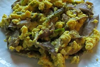 Mientras tanto limpiamos bien las setas con ayuda de un trapo húmedo y las troceamos. Después las incorporamos a la sartén, junto con los espárragos y dejamos que se cocinen durante unos 15 minutos.Troceamos los brotes de puerro y se los añadimos. Dejamos al fuego unos cinco minutos más, removiendo de vez en cuando.Batimos los huevos, añadimos una pizca de sal y le agregamos la nata. Mezclamos todo bien y lo echamos en la sartén con el resto de los ingredientes, sin parar de remover hasta que se haga el revuelto.