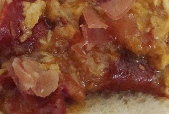 He repartido el revuelto sobre las rebanadas de pan y el jamón picado por encima.