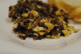 Revuelto de morcilla con piñones una receta típica de la gastronomía española.