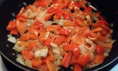 Ponemos a descongelar los langostinos y quitamos la cáscara. Reserva.Pon unas cucharadas de aceite de oliva a calentar en el fondo de una sartén. Pica la cebolla y ponlas a dorar junto con el pimiento rojo también picado y los ajos cortados en láminas.