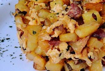 - Echar sobre el conjunto 3 huevos batidos, y remover todo junto, que se cuaje el huevo, pero sin que quede seco.