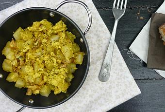 Deshuesamos el pollo y lo cortamos en trocitos. Cortamos las patatas en cuadraditos. Batimos los huevos con un chorro de leche y la media cucharadita de curry.Calentamos un chorrito de aceite en una sartén y añadimos las patatas, les damos vuelta dejando que tomen un poquito de color. Escurrimos el aceite sobrante. Añadimos el pollo y mezclamos con las patatas. Vertemos los huevos y removemos a fuego lento para hacer el revuelto. Servimos caliente espolvoreado con perejil picado.
