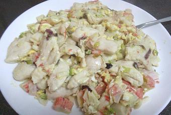 5.- Cortamos los palitos de cangrejo (surimi) en dados, y lo añadimos a la sartén. Seguimos removiendo.