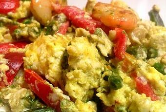 Ingredientes:Espárragos trigueros.Pimientos asados.Gambas de Huelva.Huevos, 2 por persona.Aceite de Oliva.Sal.Pimienta.