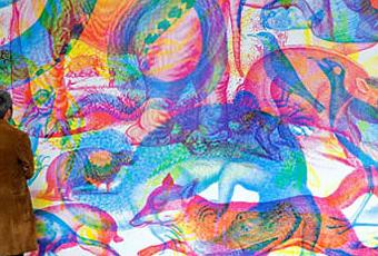 La exposición superpone tres capas de imágenes pintadas cada una en un color primario, que con luz natural muestra un gran collage de imágenes multicolor, pero una vez que se cambia el color ambiente por uno del espectro, revela imágenes ocultas.