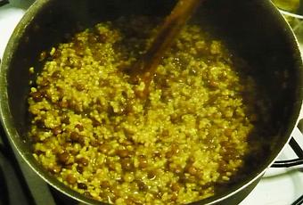 Cuando esté a temperatura ambiente agregar 1 huevo, rectificar sal y pimienta si hace falta, agregar una cucharada de queso rallado, una cucharada de queso blanco, las semillas de sésamo tostadas, un poco de pan rallado o rebozador de arroz, y las semillas de lino (cuando se remojan en un poco de agua diez minutos, más o menos, se forma una emulsión que se puede usar en reemplazo del huevo en estos casos). Mezclar y dejar enfriar en la heladera por una o dos horas para que se compacte mejor. Sacar de la heladera y agregarle un poco más de pan rallado o rebozador, si todavía está poco consistente. Si tienen uno de esos aparatitos muy sencillos para hacer hamburguesas buenísimo, sino pueden usar una tapa gruesa de algún frasco (ideal una como la del frasco de café instantáneo), porque el molde ayuda a darle la forma buscada, a no poner de más y a que quede más compacta.