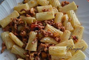 Bueno ya estoy de vuelta, después de pasar unos días entre montañas en Huesca, Benasque exactamente, vengo con los pulmones llenos de aire puro y lista para seguir esta aventura culinaria, así que vamos al lío. Hoy traigo este plato de pasta Rigatoni con carne y verduras, un plato único y muy completo no le faltan nutrientes, tiene de todo pasta carne y verduras, no os parece!! y encima fácil de preparar se puede pedir más.Vamos con la receta.Ingredientes:Rigatoni (pasta)1/4 de carne picada mixtaUn diente de ajoUna cebolla Un pimiento verdeUna berenjenaTres tomates madurosSal y pimientaUna pizca de azúcarChile (opcional)Aceite de olivaPreparación:Hervimos la pasta como de costumbre, escurrimos y reservamos.Vamos a preparar el sofrito en primer lugar freiremos la carne picada, la salpimentamos.Lavamos las verduras y troceamos muy pequeño todo, el tomate lo rallaremos.Una vez este la carne echamos el ajo, luego la cebolla, cuando empiece a dorarse, añadimos el pimiento y la berenjena, lo sofreímos todo y añadimos el tomate rallado, echamos el azúcar y lo vamos removiendo hasta que este bien frito el tomate.Mezclamos la pasta y el sofrito bien y emplatamos.Como sugerencia añadir un poco de chile molido por encima.Seguro que os encantara.Que aproveche!!https://www.facebook.com/midiversionenlacocina