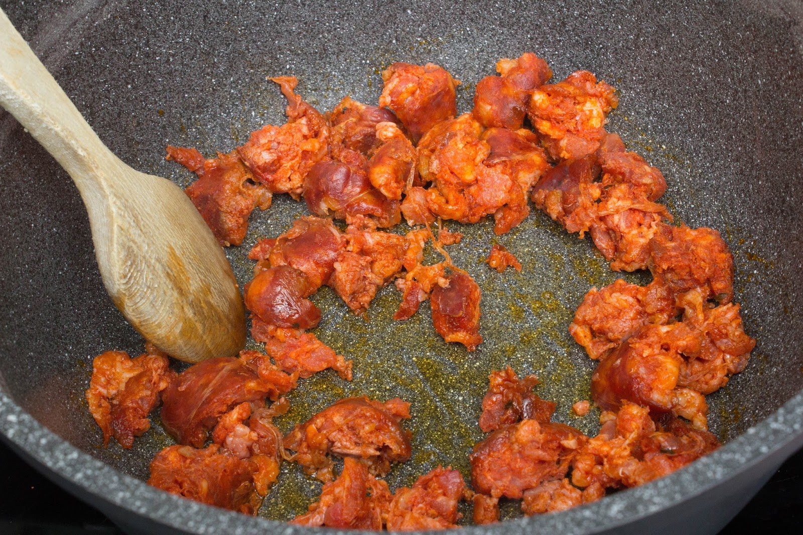 En una sartén con un poco de aceite pones el chorizo en trocitos.