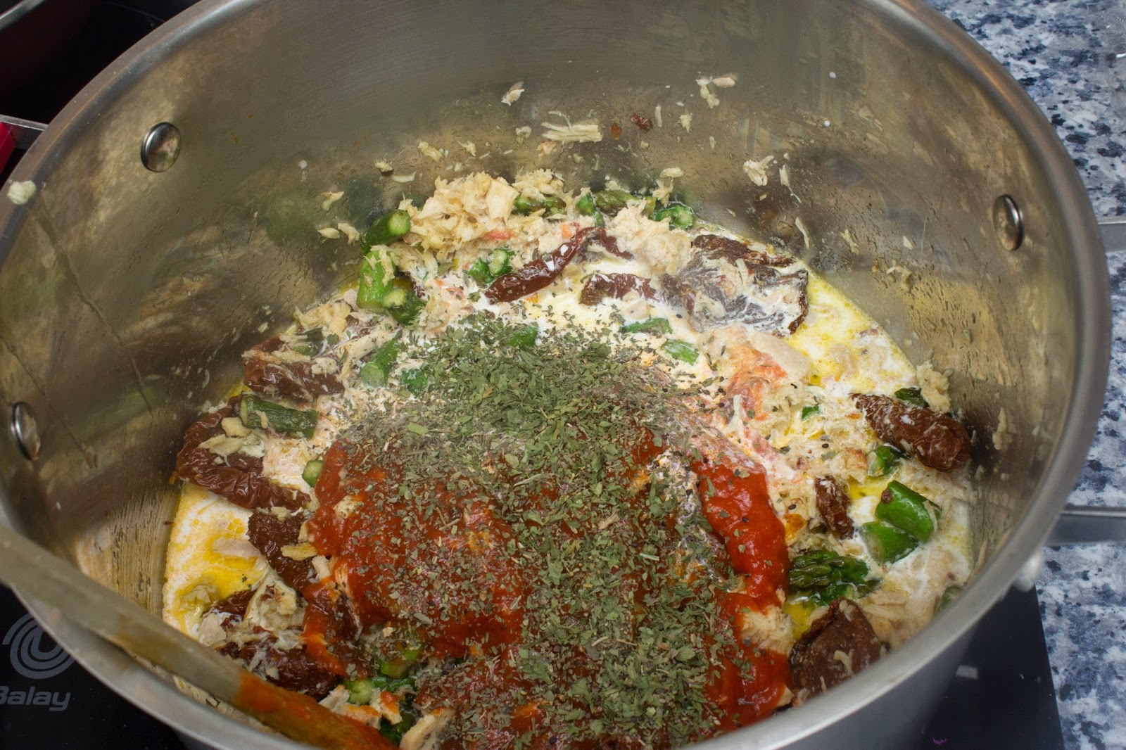 Escurre el tarro de tomates secos en aceite y los echas en la cazuela con los demás ingredientes. Yo los puse enteros pero si no os gusta comer cachos grandes córtalos en trocitos.