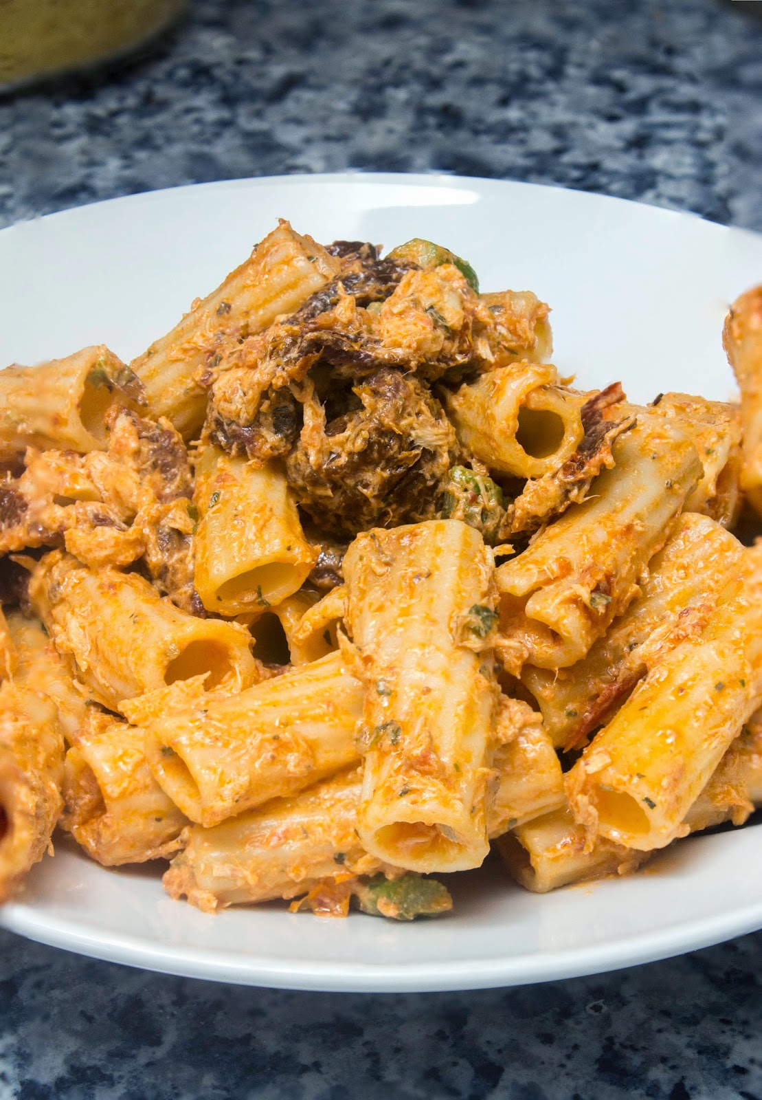 No sabía que receta escoger del blog El Mito del Sofrito, porque tiene cosas deliciosas, pero al final me decidí por sus rigatoni con espárragos verdes. He hecho una versión un poquito diferente con atún y tomates secos. ¡Simplemente deliciosos!