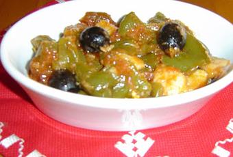 Añadir los tomates troceados y el azúcar, sazonar y continuar friendo a fuego lento. Cuando esté todo frito (unos 40 minutos), añadimos las aceitunas, le damos unas vueltas y lo mezclamos todo bien.