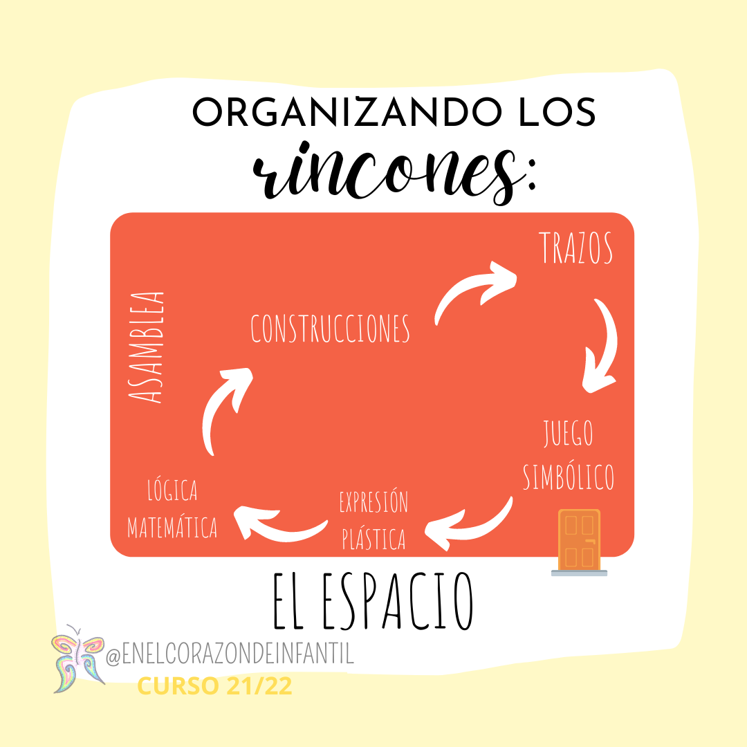Hoy les voy a hablar un poquito de cómo organizo el espacio por rincones en mi aula. Vamos a tomar como referencia esta imagen, que muy sencillamente ilustra la distribución de este curso 21/22: