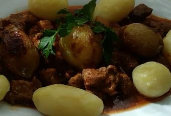 Esta receta es una receta de bruno oteiza, es un plato típico austriaco con ternera guisada acompañada de cebollas glaseadas. INGREDIENTES: 250 gr de jarreté de ternera para guisar http://www.cachenasdesanbreixo.com/ 1 cebolla 4 cebollitas 40 gr de tocino http://www.embutidosismael.net/ Una rebanada de pan seco 1 cucharita de concentrado de tomate 5 g de azúcar Un vaso de caldo de carne Un chorrito de vinagre Aceite de oliva Sal Pimienta negra Una cucharadita de pimentón dulce http://www.joseluismateos.com/jlmateos/ Perejil picado ELABORACIÓN: Para glasear las cebollitas, pelarlas y ponerlas en un cazo con un poco de aceite. Salpimentar espolvorear con el azúcar por encima y cocinar a fuego suave hasta que estén doradas y blanditas. Reservamos Trocear la cebolla y dorarla en la cazuela con un poco de aceite. Salpimentar la carne y cortarla en dados grandes, dorar los trozos en una sartén con un poco de aceite e incorporarlos a la cazuela junto con la cebolla. Agregar el pimentón, el pan y el tocino troceado y vertemos el caldo de carne, sazonamos y tapamos y cocinamos durante veinte minutos a fuego medio. Retiramos la carne de la cazuela y trituraremos la salsa con en minipimer, volvemos añadir la salsa a la cazuela junto con la carne y la cucharada de concentrado de tomate y un chorrito de vinagre le daremos un hervor. Yo serví la carne con unas patatas redonditas des las que venden en paquete o en taro, las pase un poco por la satén para que quedaran doraditas. Y luego con abundante salsa acompañada con las cebollas glaseadas y decoramos con perejil picadito.